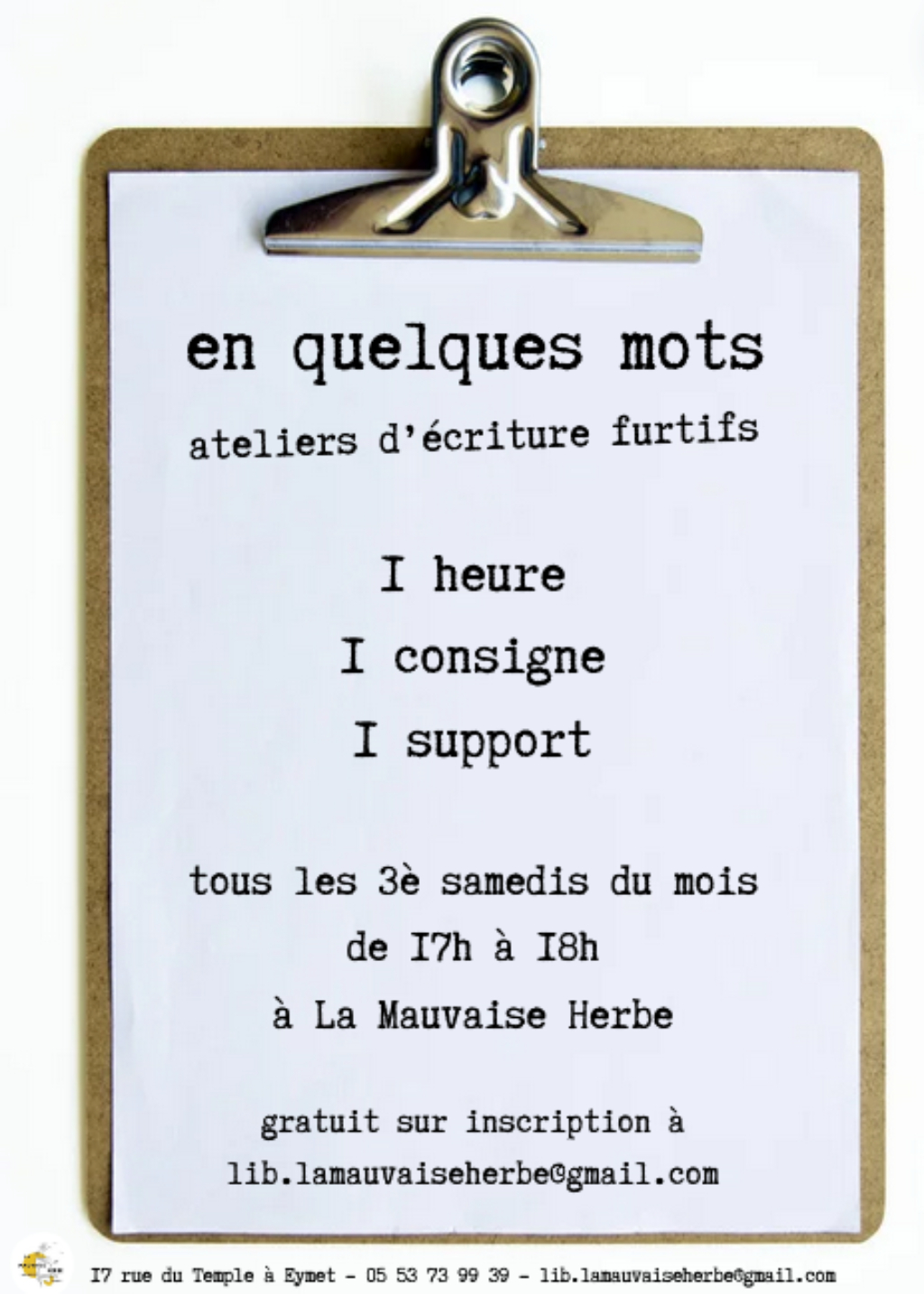 Tous les troisièmes samedis du mois, retrouvez Sébastien pour une heure d'écriture furtive et qui vous propose un exercice d’écriture au format très simple : une heure, une consigne, un support différent à chaque séance.