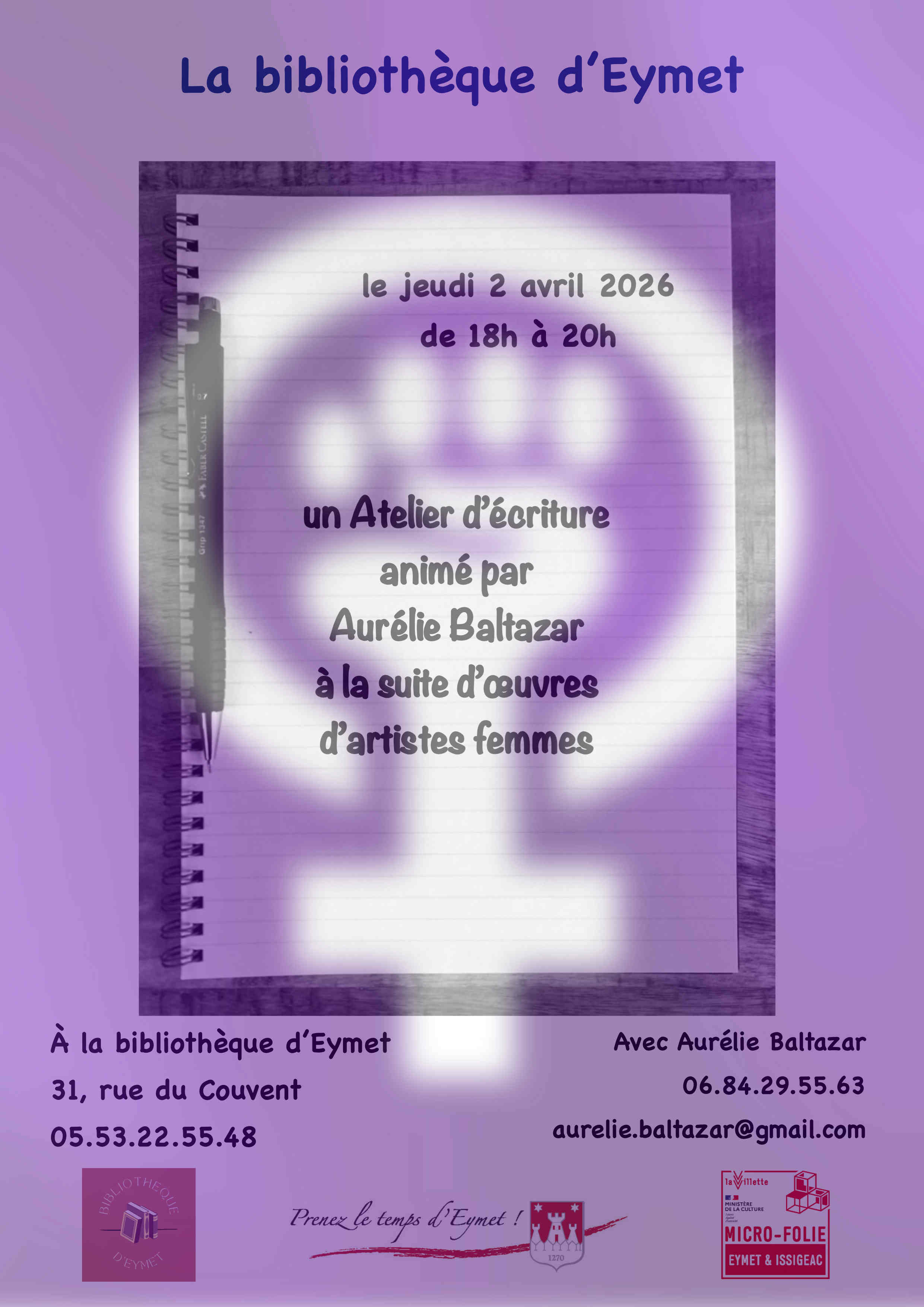 Venez nombreux participer à l'atelier d'écriture animé par Aurélie Baltazar à la suite d'œuvres d'artistes femmes.