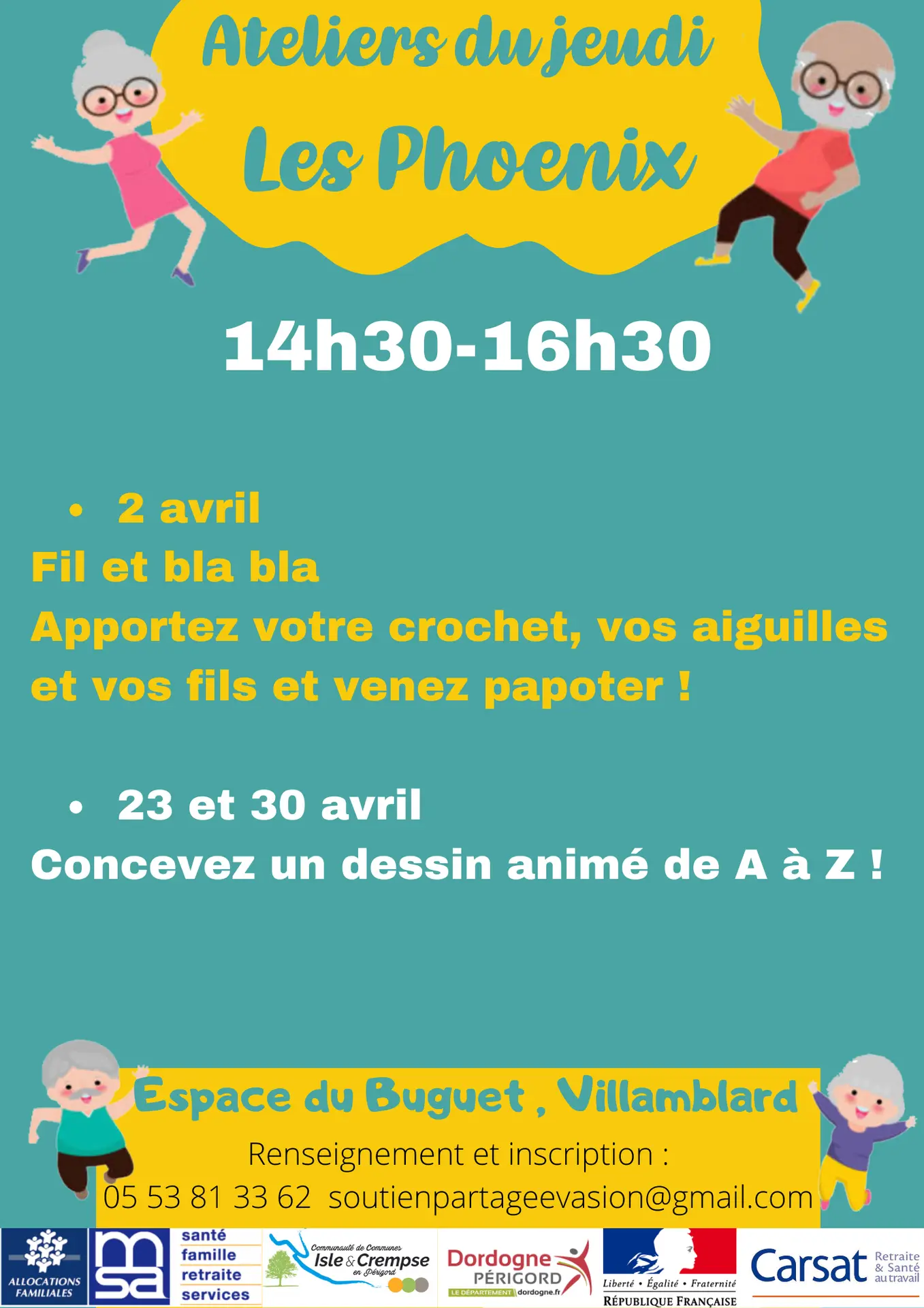 Les Ateliers du Jeudi ouverts à tous les séniors : conception d’un dessin animé de A à Z à 14h30, espace du Buguet. Tél: 05 53 81 33 62. SPE