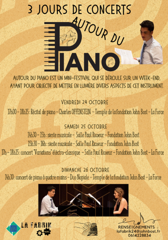 · 17h – 18h15 : Concert Variations électro-classique (Salle Paul Ricoeur – Fondation John Bost), qui mélange musiques classiques et électroniques.