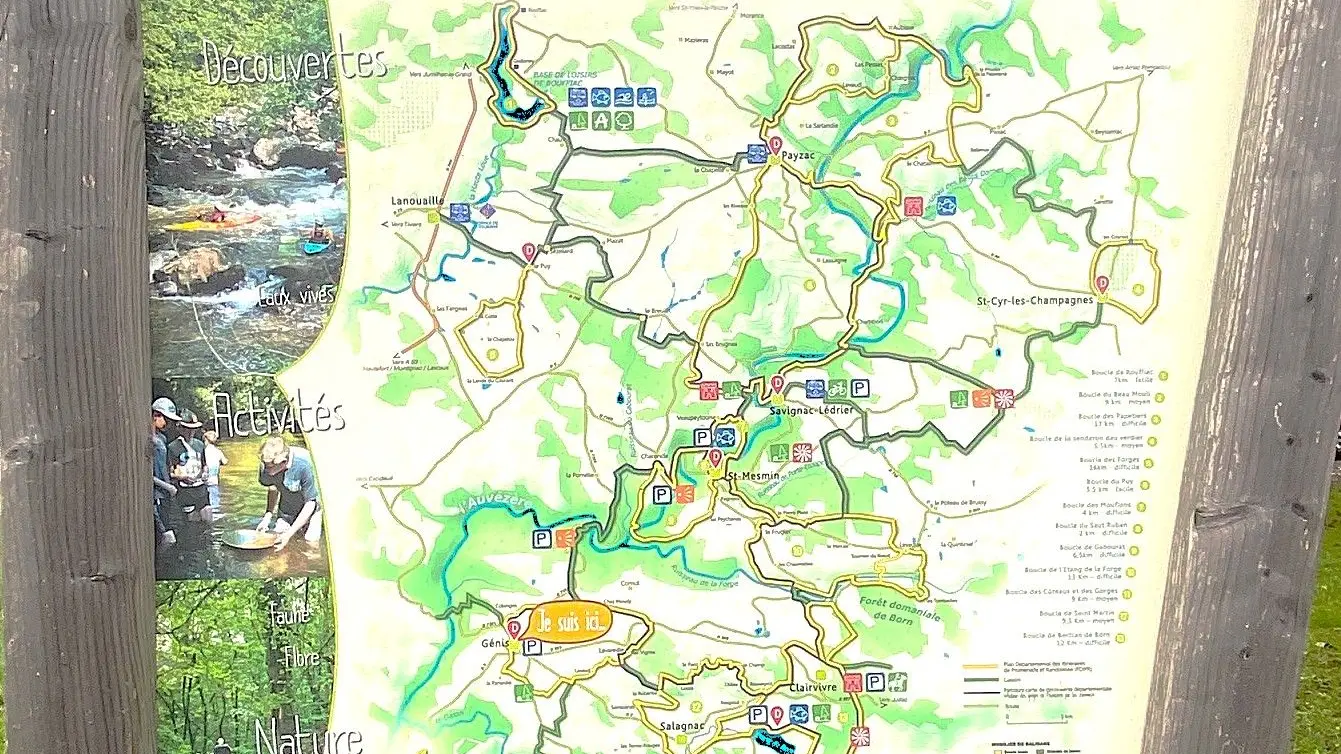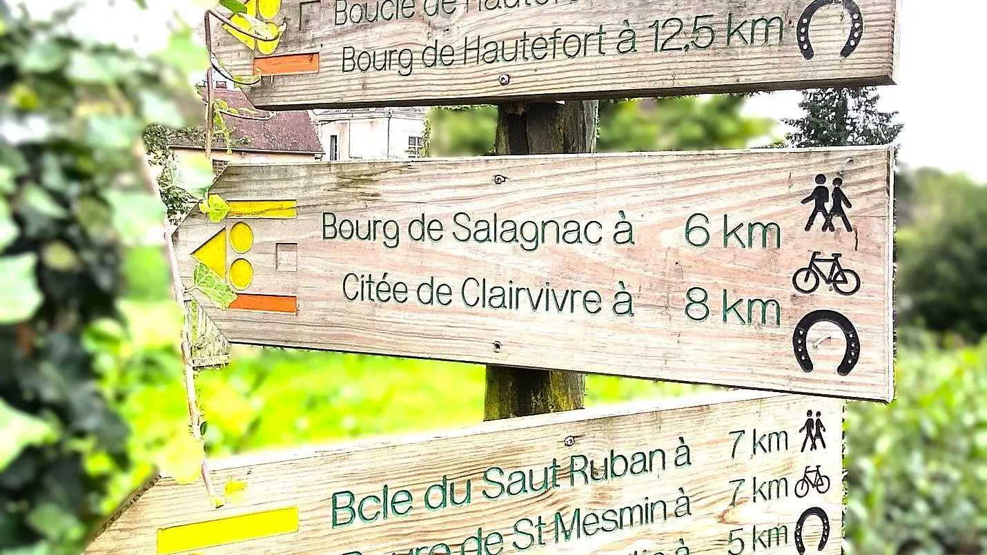 Depuis le Panneau d’Appel situé devant la Mairie, revenir vers le bourg par l’avenue du 8 mai puis descendre à droite par D5 direction Cherveix-Cubas. A 50m partir à gauche direction, la Panardie, Moruscle.