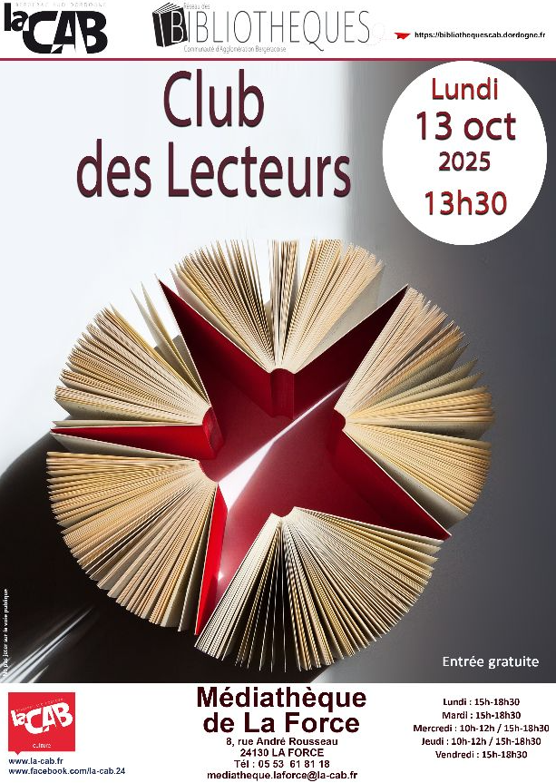 CLUB DES LECTEURS : Le club des lecteurs de La Force prend la forme de rencontres ouvertes à toutes et tous pour parler de ses coups de cœur. Quand on a aimé un livre, quelle joie de relever ses points positifs et d'exprimer ses émotions ou des réflexions qu’il a suscitées, et de partager ! On ressort toujours de ces rencontres avec de nouvelles idées à ajouter à notre "pile à-lire" !