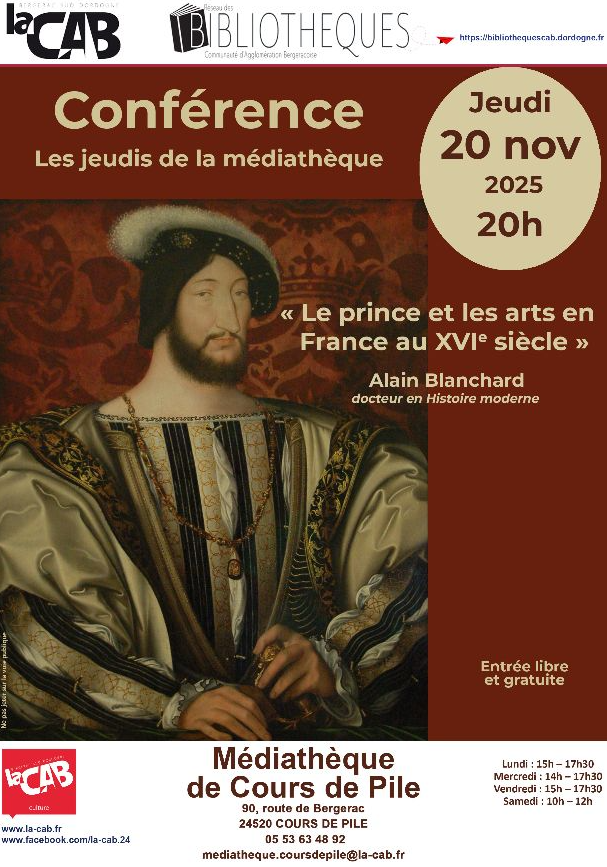 Venez assister à la conférence « Le prince et les arts en France au XVIᵉ siècle », organisée à la médiathèque de Cours-de-Pile.