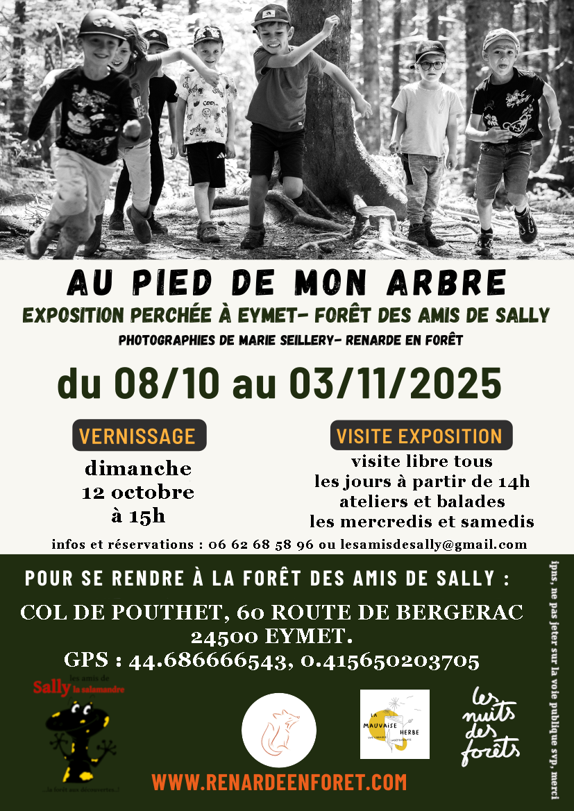 "Au pied de mon arbre" est une exposition perchée, d'une douzaine de photos grand format de Marie Seillery, au sujet de la mise en lumière de la pédagogie par la nature, à travers des ateliers de jeux en forêt, qui seront accrochées entre des arbres dans la forêt des Amis de Sally