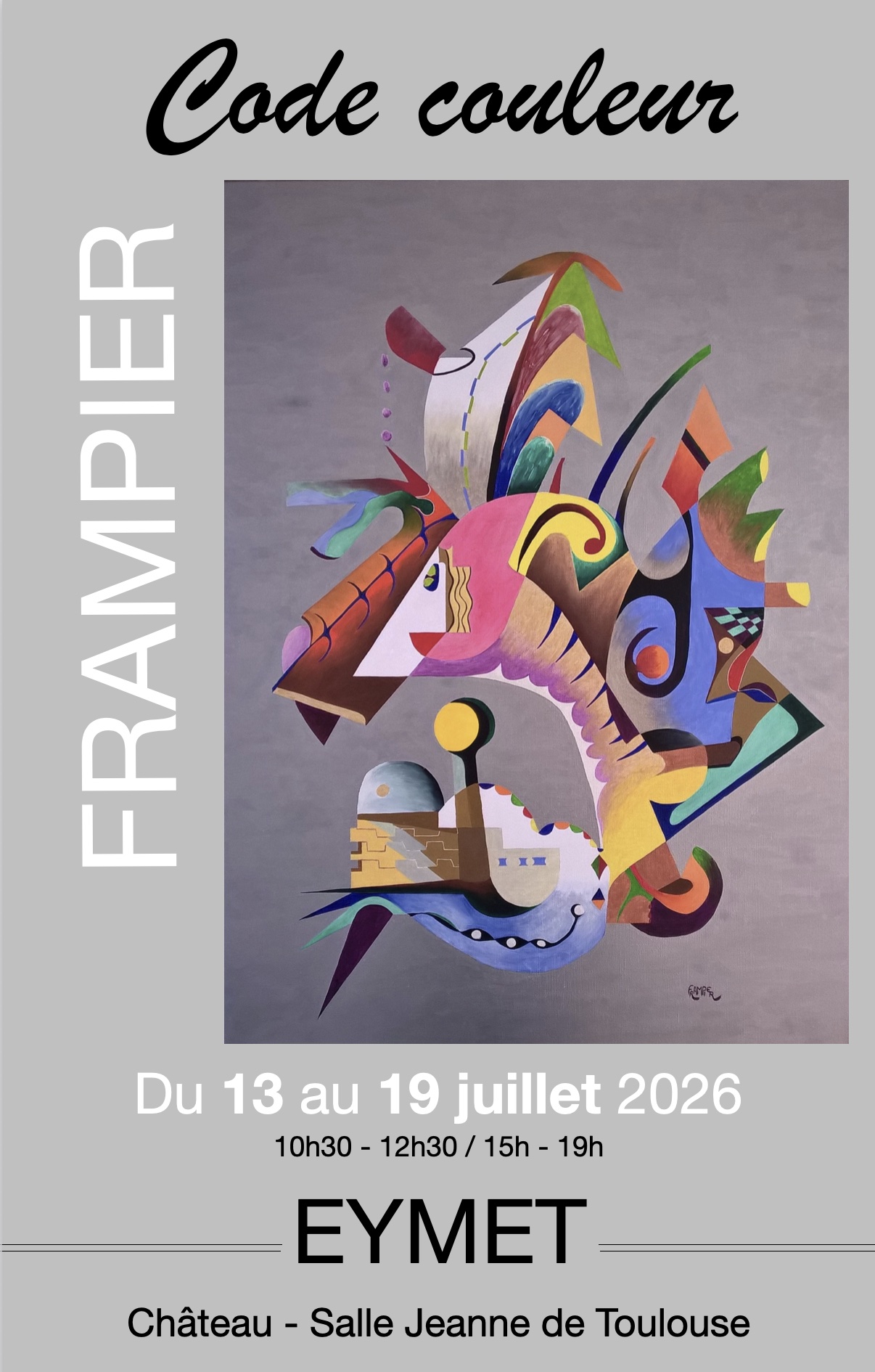 D. Frampier : « Code Couleur » est le fruit de l'alchimie de la création. Il définit ma recherche permanente d'équilibre entre les formes et les couleurs. Je propose une expression abstraite en harmonie de couleurs. Il s’agit d’une représentation imaginaire et structurée dont les sujets aussi divers que variés sont la retranscription imagée d’un univers décalé.