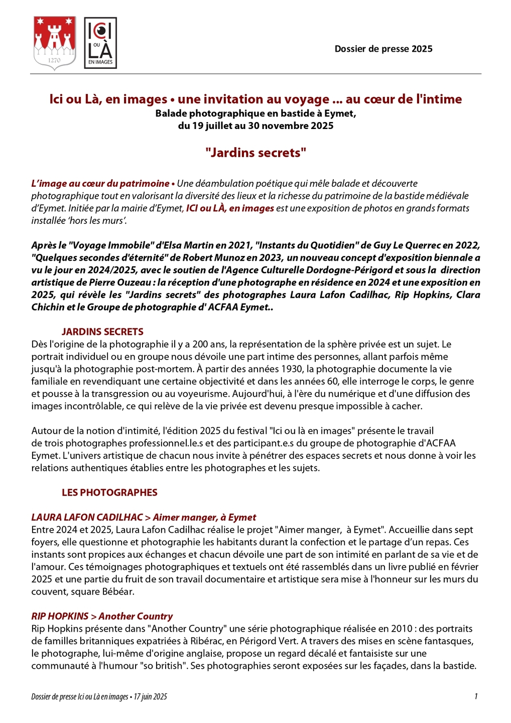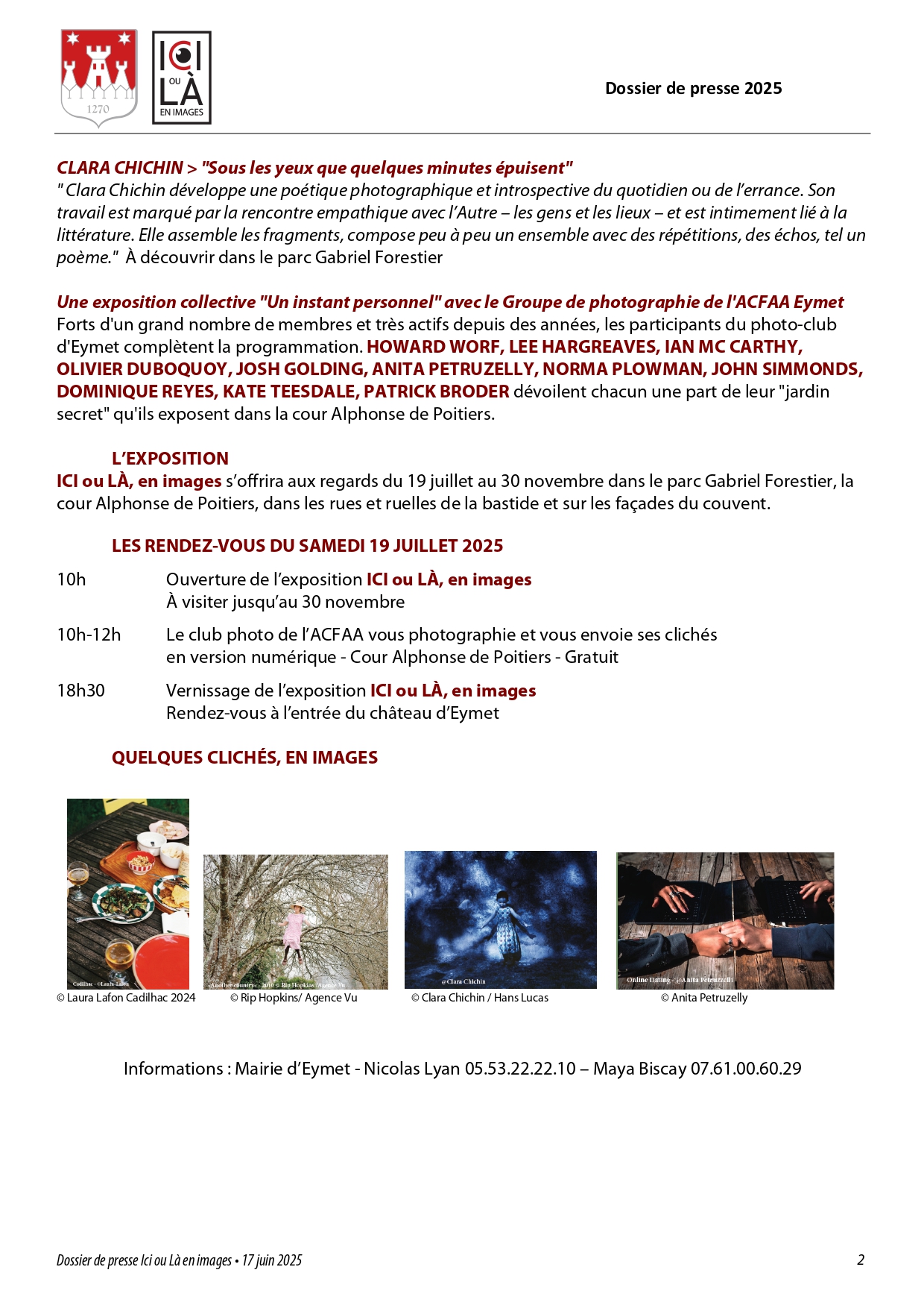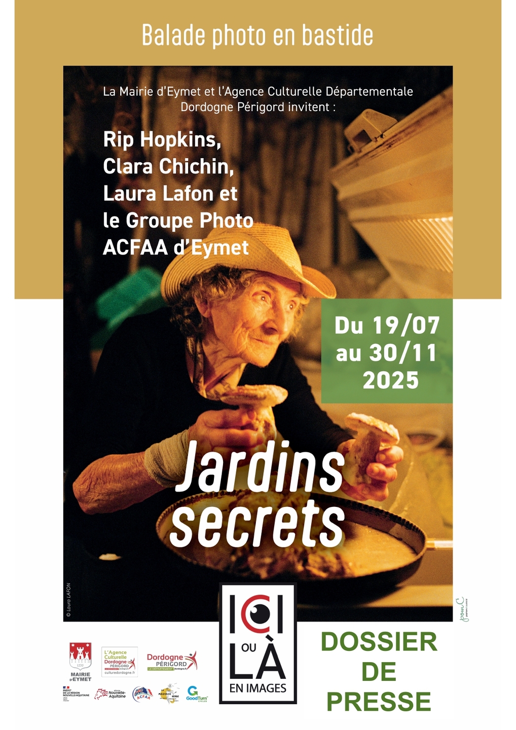 Une déambulation poétique qui mêle balade et découverte photographique tout en valorisant la diversité des lieux et la richesse du patrimoine de la bastide médiévale d’Eymet. Initiée par la mairie d’Eymet, ICI ou LÀ, en images est une exposition de photos en grands formats installée ‘hors les murs’.