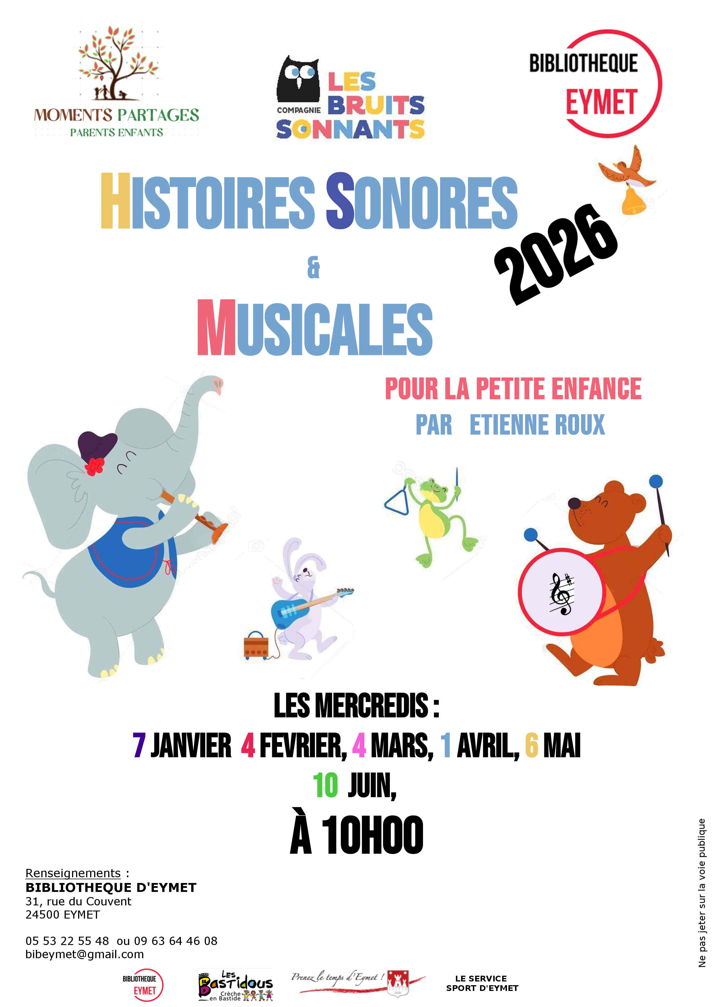 À partir d'un poème, d'une histoire, d'une chanson apprise à l'école, l'intervenant forme le public à bruiter, à mettre en son et en musique les émotions de cette dernière... Atelier animé par Étienne Roux de la Compagnie des Bruits Sonnants.