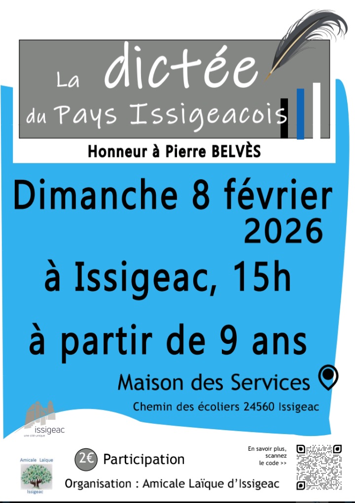 L'association de l'Amicale Laïque d'Issigeac vous convie à la dictée du Pays Issigeacois. Cette édition sera mise à l'honneur d'une enfant du village : l'illustrateur-pédagogue, écrivain Pierre Belvès.