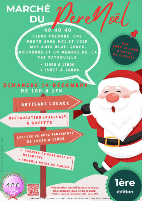 Au programme : artisanat local, restauration et buvette, une lecture de Noël Kamishibai de 14h30 à 15h, la parade du Père Noël et de ses mascottes, ainsi qu’une tombola “Poids du panier”.