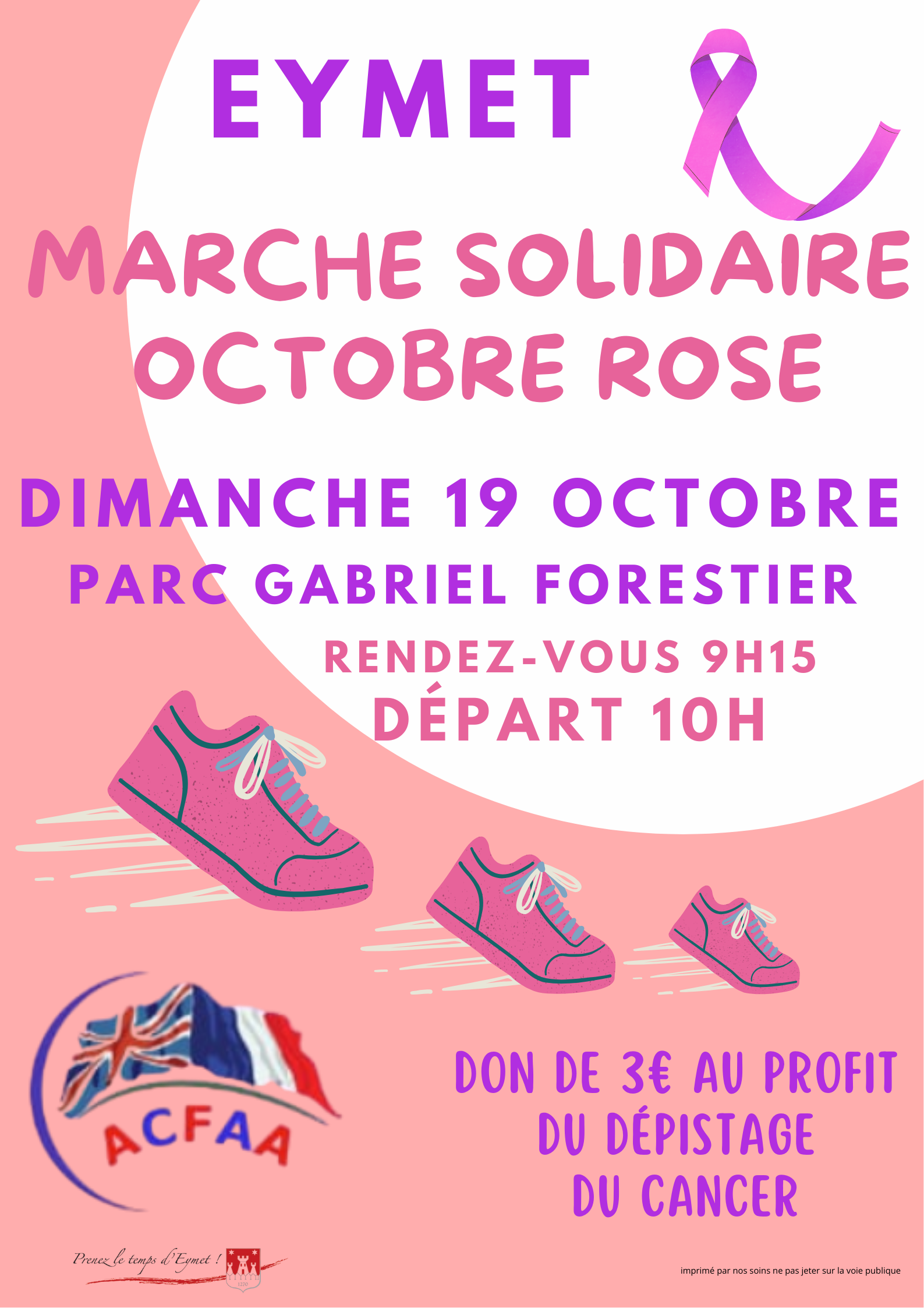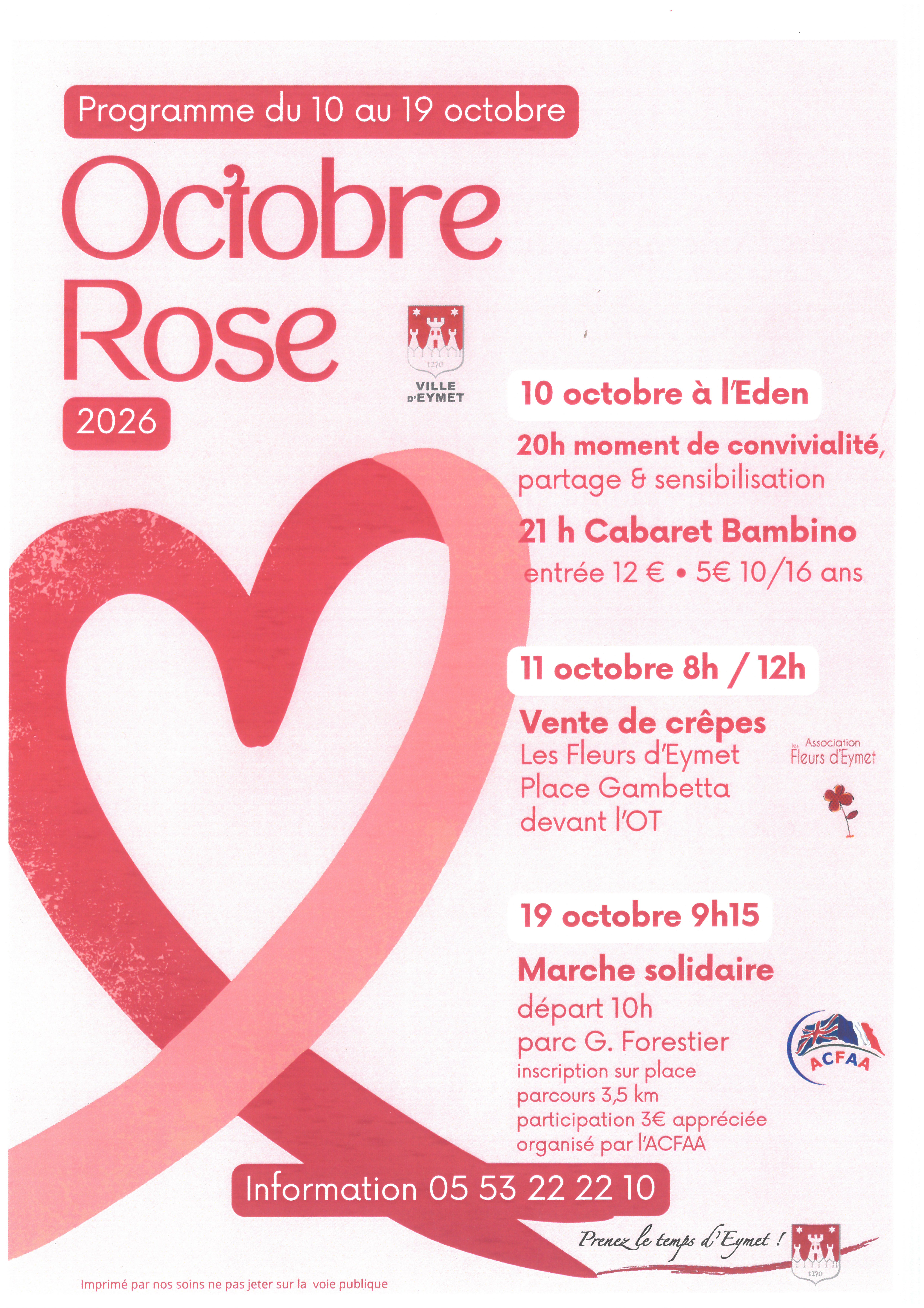 Organisée par l’ACFAA et la mairie d’Eymet, une participation de 3€ par personne sera appréciée. Des goodies Octobre Rose seront également proposées à la vente avant le départ de la randonnée. Comme chaque année, l’intégralité des recettes d’Octobre Rose sera reversée à la cause.