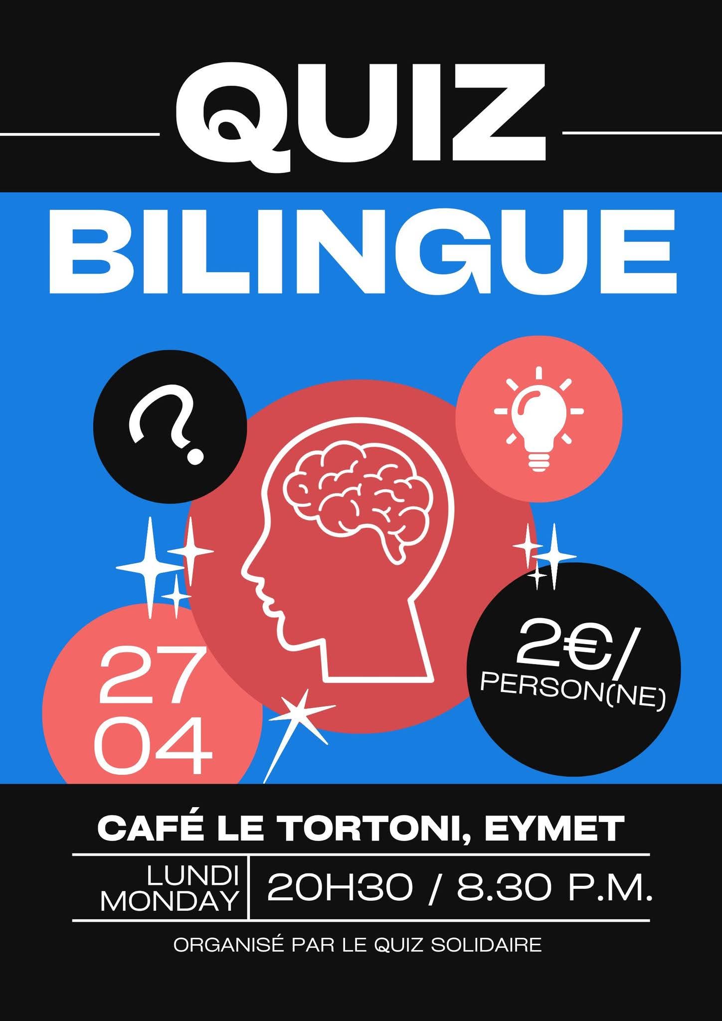 Rejoignez-nous pour une soirée pleine de bonne humeur pour un quiz bilingue ! Les équipes peuvent compter jusqu'à 6 personnes. Tous les bénéfices des entrées seront reversés à une association caritative.