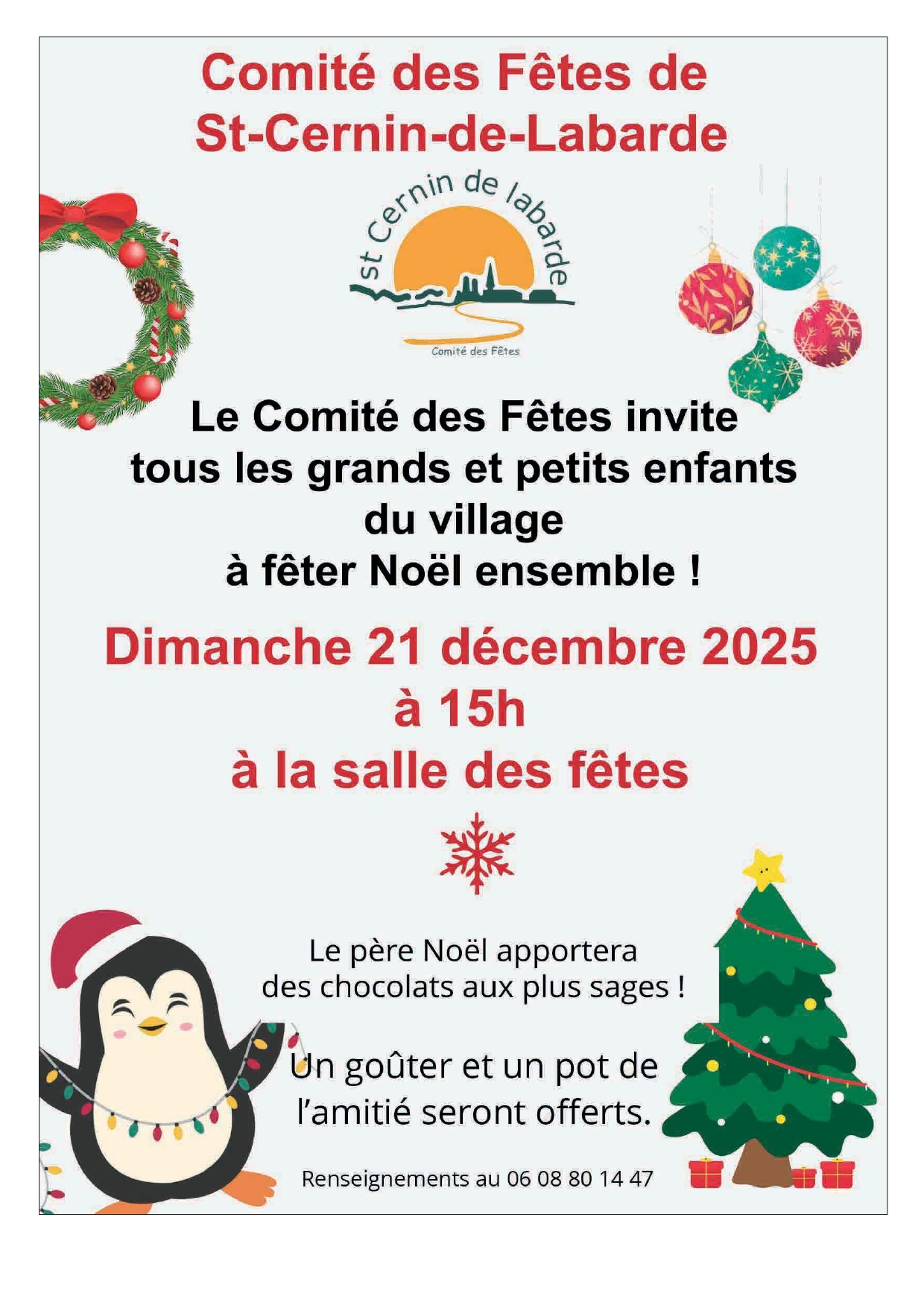 Le comité des fêtes invite tous les grands et petits enfants du village à fêter Noël ensemble. Le père Noël apportera des chocolats aux plus sages ! Un goûter et un pot de l'amitié seront offerts.
