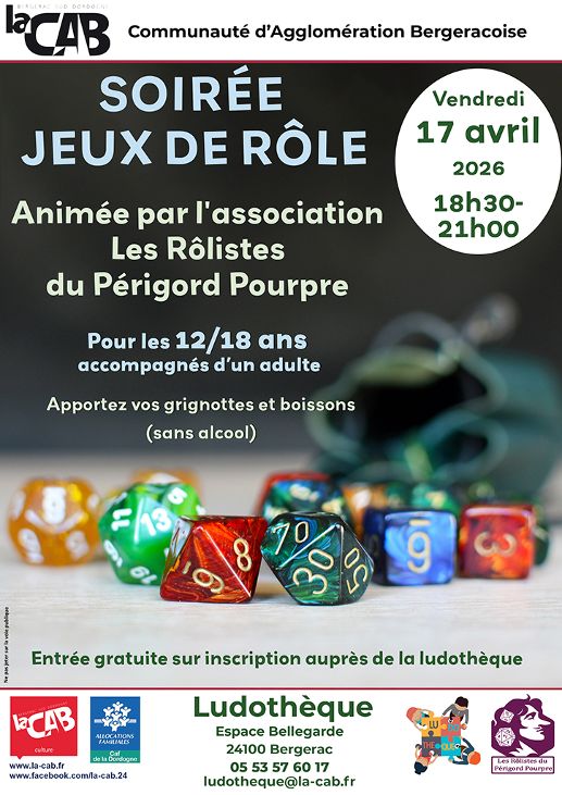 Venez participer à notre soirée jeux de rôle, animée par l'association Les Rôlistes du Périgord Pourpre. Cette activité est dédiée aux 12-18 ans accompagnés d’un adulte. Apportez vos grignottes et boissons (sans alcool).