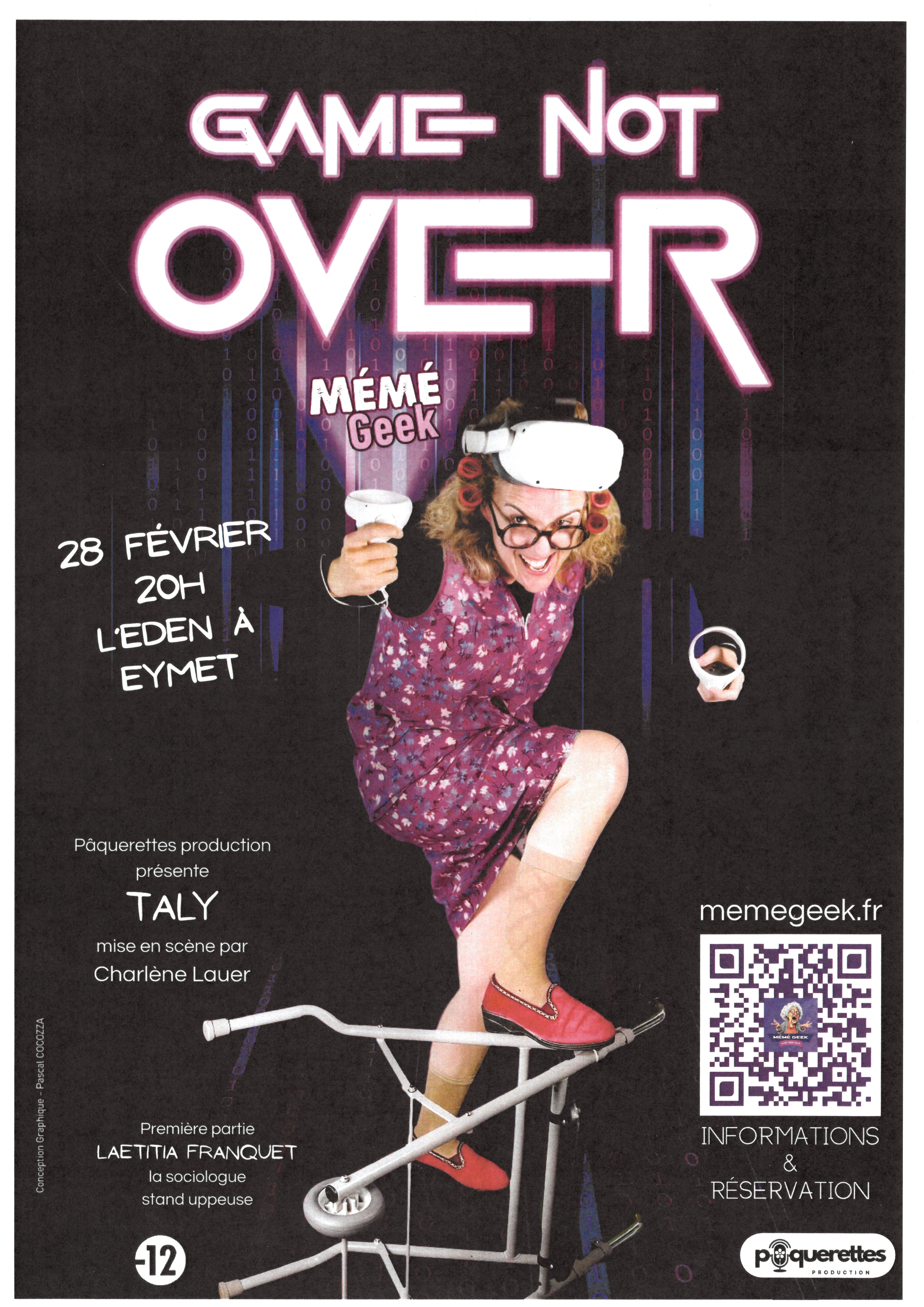 Pendant que certains tremblent devant les nouvelles technologies comme devant le diable, Mémé Geek s’éclate à cœur joie avec elles. Jeux vidéos, casque de réalité virtuelle, imprimante 3D, réseaux sociaux : pour elle, tous les moyens sont bons pour délirer, oublier ses 80 printemps et servir son plaisir… pour le plus grand bonheur de son public. Le monde du virtuel, les relations parents - enfants, le grand âge, le sexe, le crochet, le cyber harcèlement… tout est vu par le prisme de l’esprit décalé de Taly. Accrochez-vous, car vous serez projetés dans un monde hors normes où tout devient possible pour Mémé Geek… puisque “ The game is not over ” !