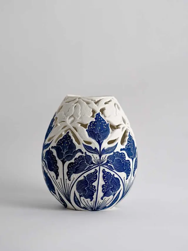 Léa Zanotti commence certaines journées par le coulage de nouvelles pièces, puis consacre le reste de son temps au décor des pièces déjà prêtes. Dans son petit atelier, casque sur les oreilles, portée par un livre audio ou un podcast, elle enchaîne les pièces avec une patience inlassable. Il est difficile d’imaginer le temps nécessaire à ces motifs aux innombrables détails. Une chose est certaine : ces gestes exigent lenteur, précision et constance. À la manière d’une brodeuse, elle gratte la surface bleue pour faire réapparaître le blanc de la porcelaine. Graver, épousseter, délier le poignet pour épouser la courbe et laisser vibrer l’outil — ici, l’approximation n’a pas sa place.