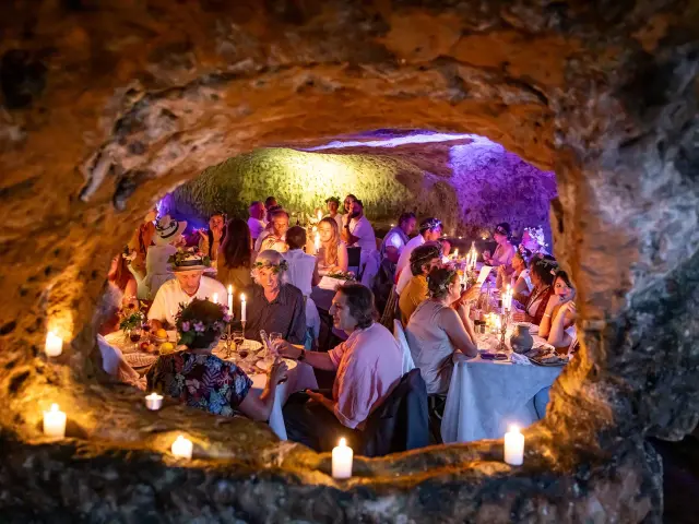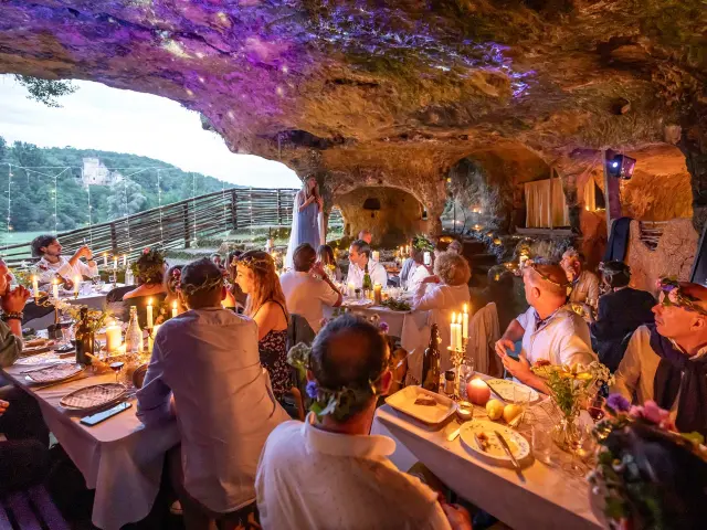 Vivez un dîner intimiste au Château de Commarque, dans ses cavités troglodytiques, disponible en mai, juin, septembre et octobre pour les groupes.